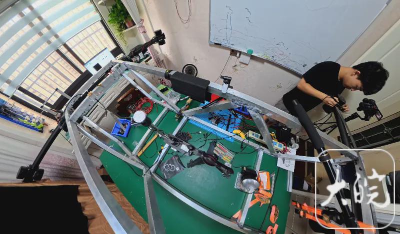 李邦华向记者介绍,飞行器从图纸到现实,主要分为三个阶段,首先是前期图纸设计、建模,其次便是通过电脑对各项数据进行分析,判断结构是否稳定、动力如何分配布局等,而最后便是根据数据内容采购材料并进行焊接组装,其中,组装最耗时耗力,“因为没有专业的机械设备,全部是靠手去掰弯和调整,焊接则是由父亲和我共同完成。”