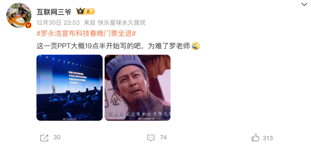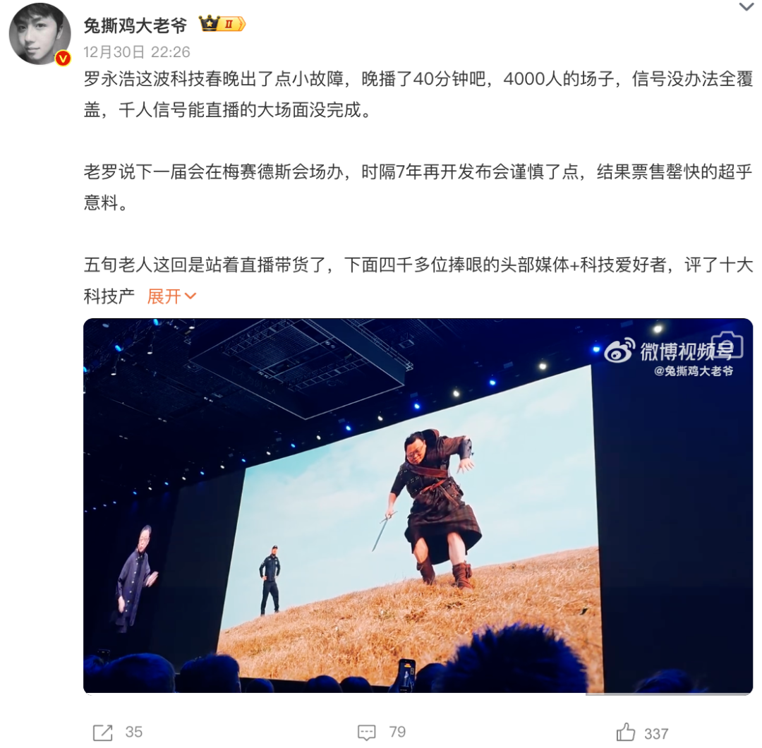 12月30日的发布会,罗永浩又又又迟到了。上场后他表示“发生了一些事情,向大家道歉。后续会发文解释一下,希望大家理解”。于是今早网友们醒来,看到了这样一条微博。