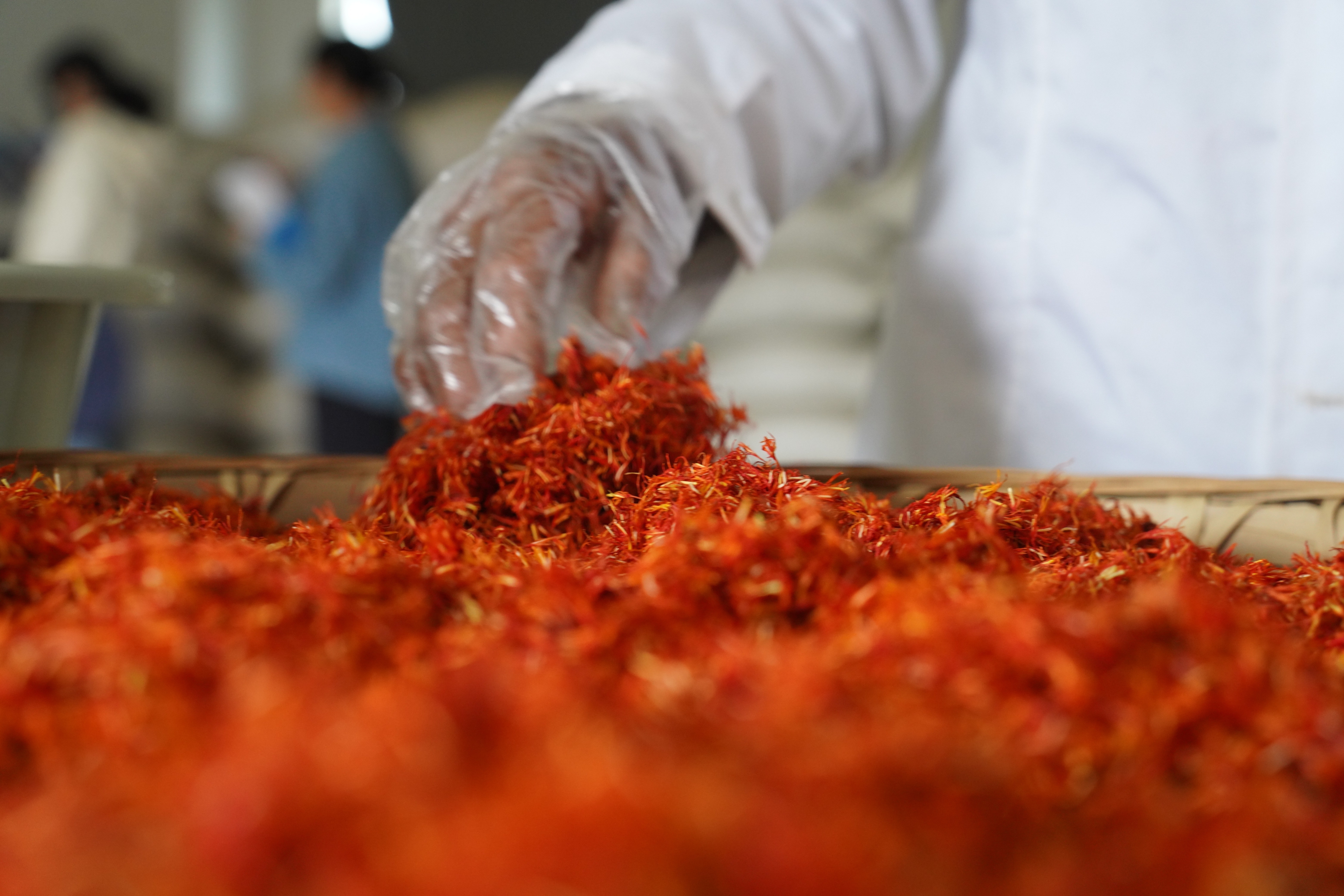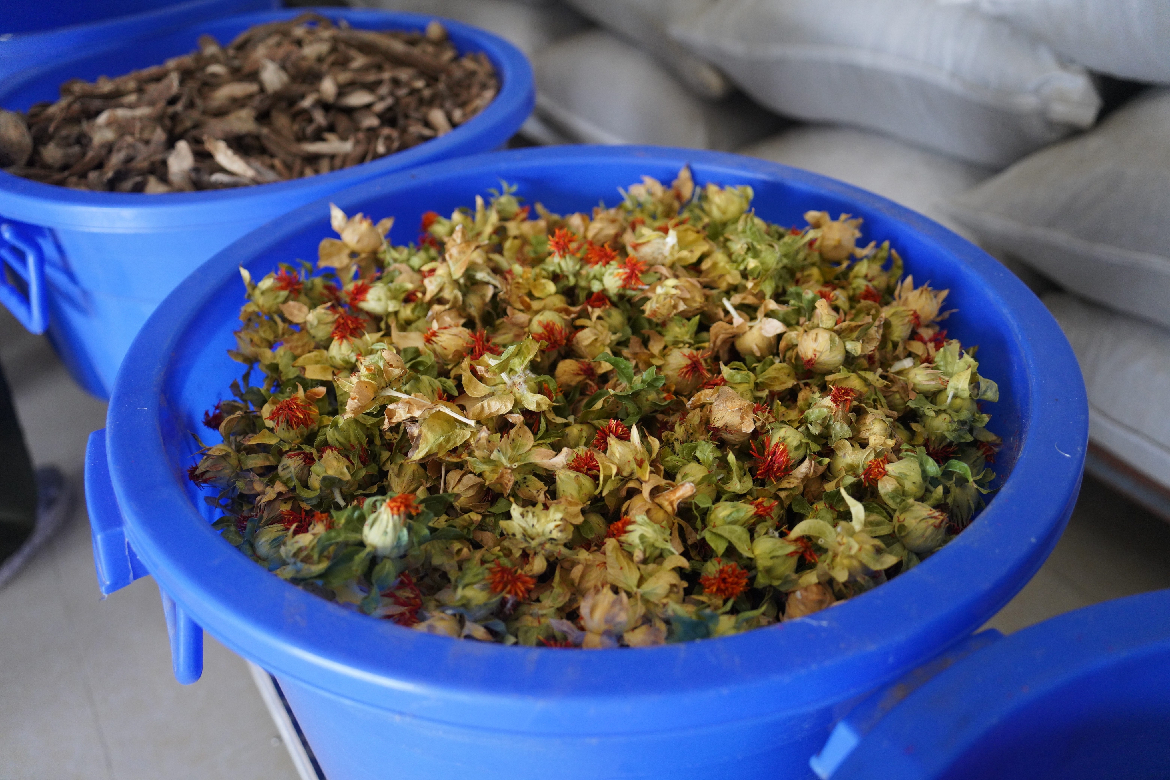 ▲在曲松镇琼嘎村藏药材种植加工专业合作社,生产车间里的草红花原料。中国网记者 胡俊 摄